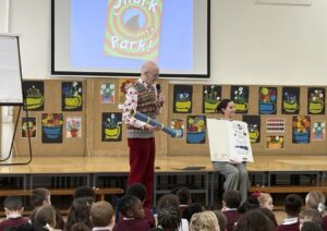 Nick also took part in an assembly for the whole school, where he taught the children to draw two characters from his books and read the story Shark in the Park.